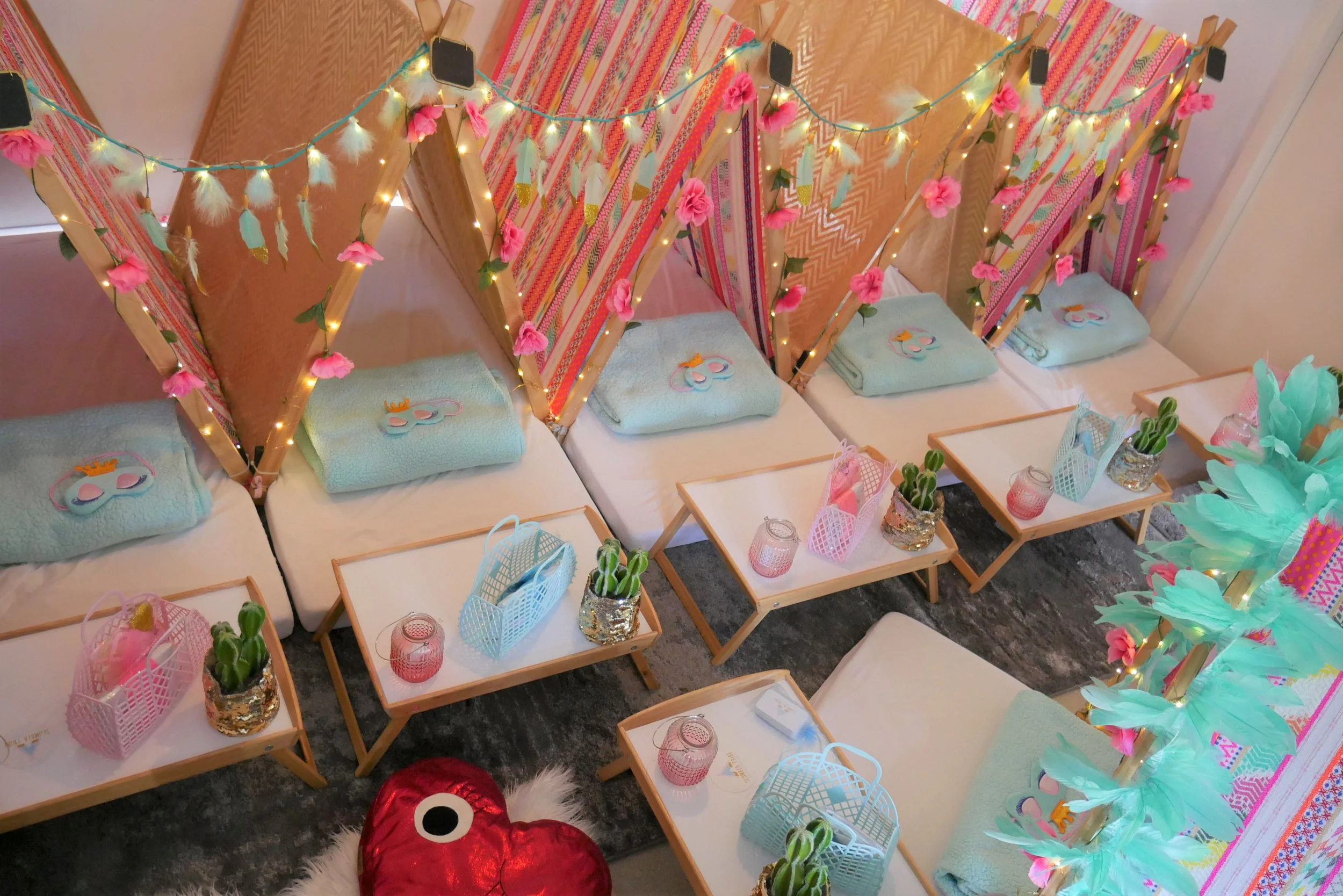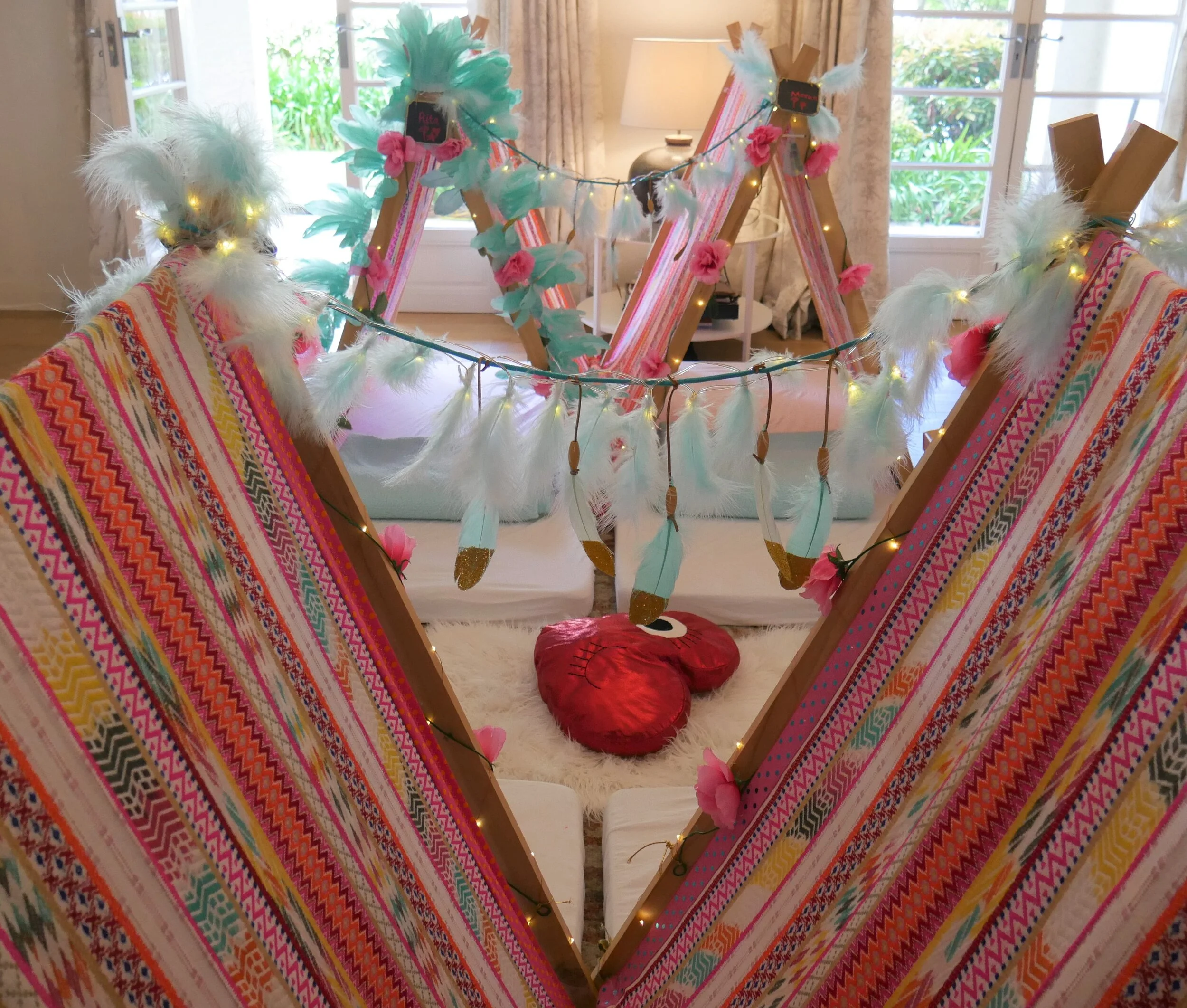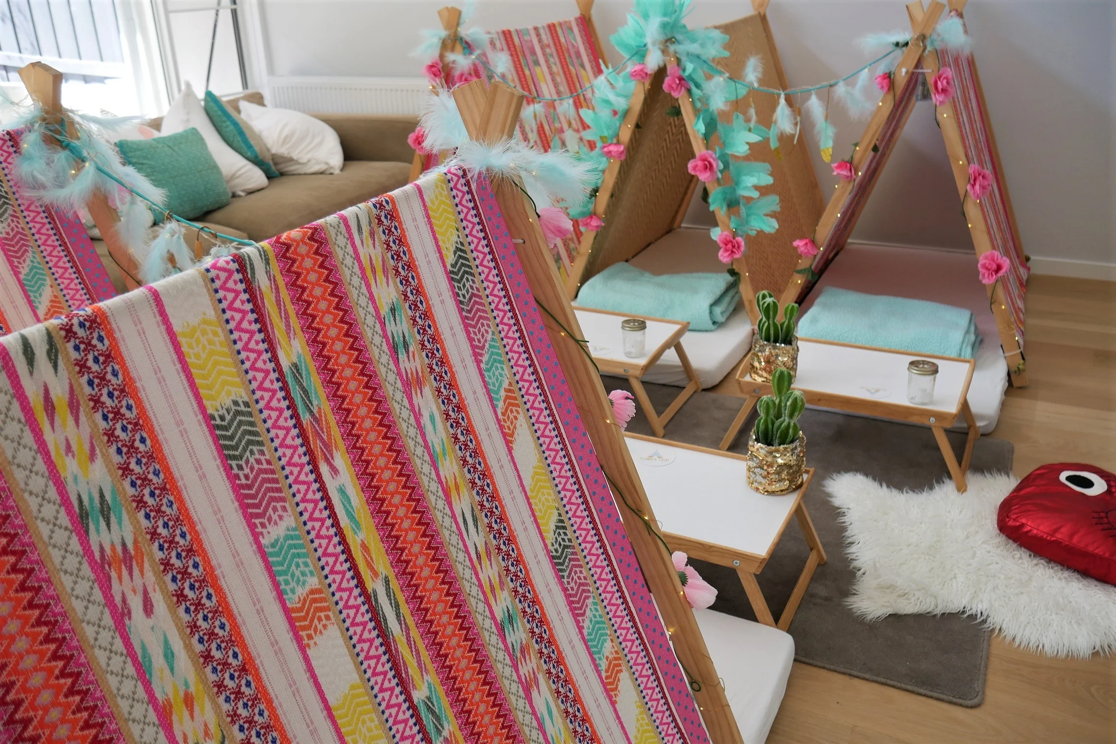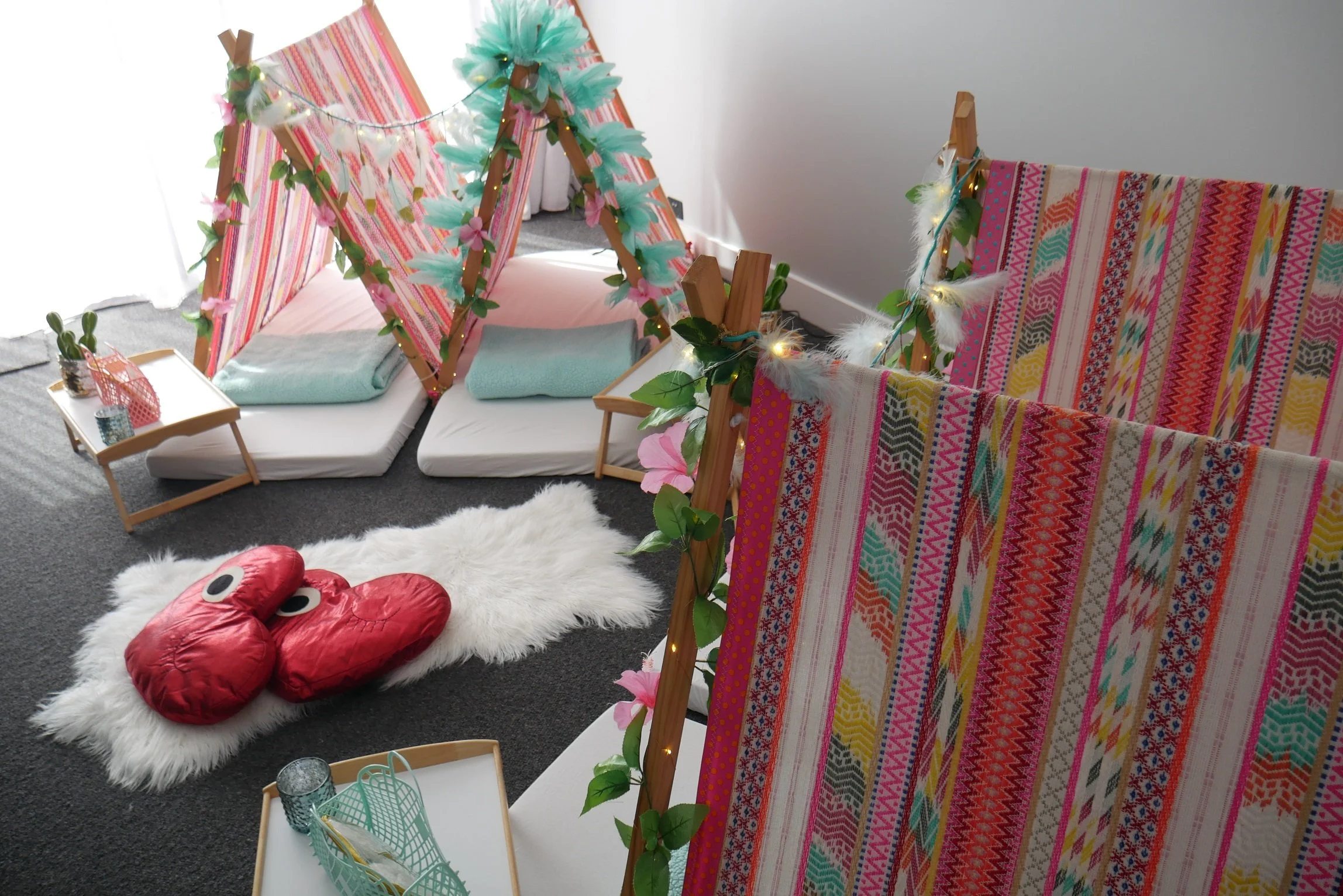 This is a beautiful and vibrant slumber party theme appealing to young girls of all ages. It's Slumber Tribe’s Coachella inspired theme and ever popular and comes with a range of decorations, metallic heart KIP & Co cushion for the birthday girls teepee and rug. Check out our gallery for some example pictures.